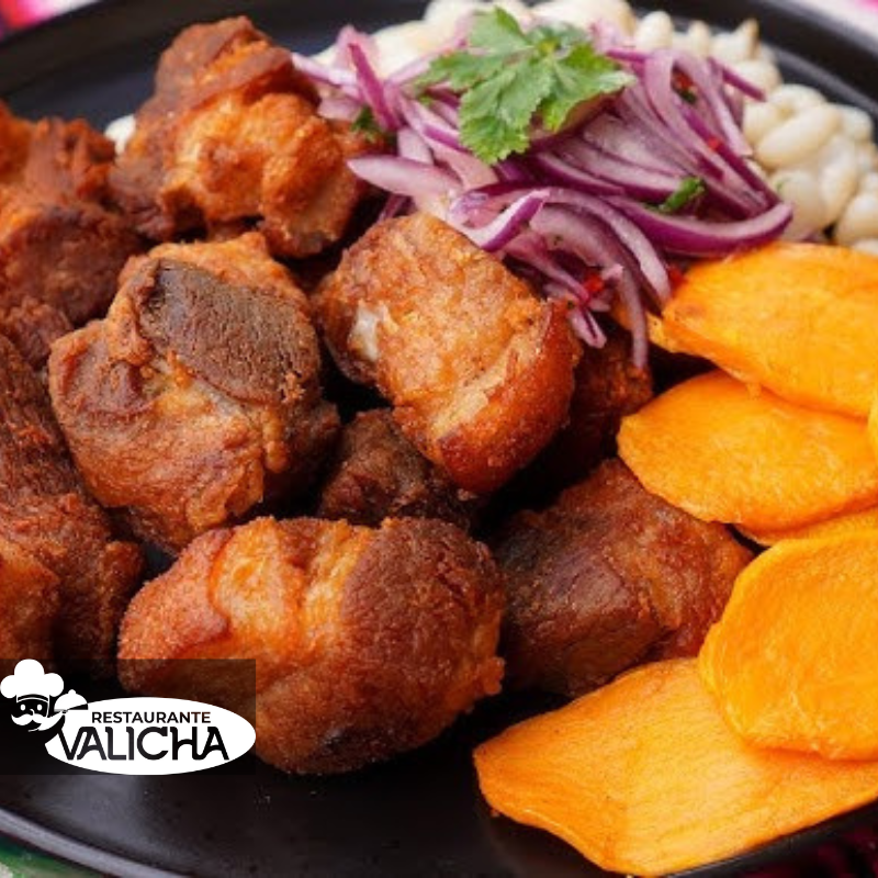 El Chicharrón de Cerdo es un plato típico de varias regiones del Perú, pero tiene especial relevancia en la sierra, donde se prepara de manera tradicional. Es un plato muy popular que se consume en festividades y en el desayuno, especialmente los fines de semana. Consiste en trozos de cerdo cocidos y fritos hasta que queden crujientes por fuera y jugosos por dentro.